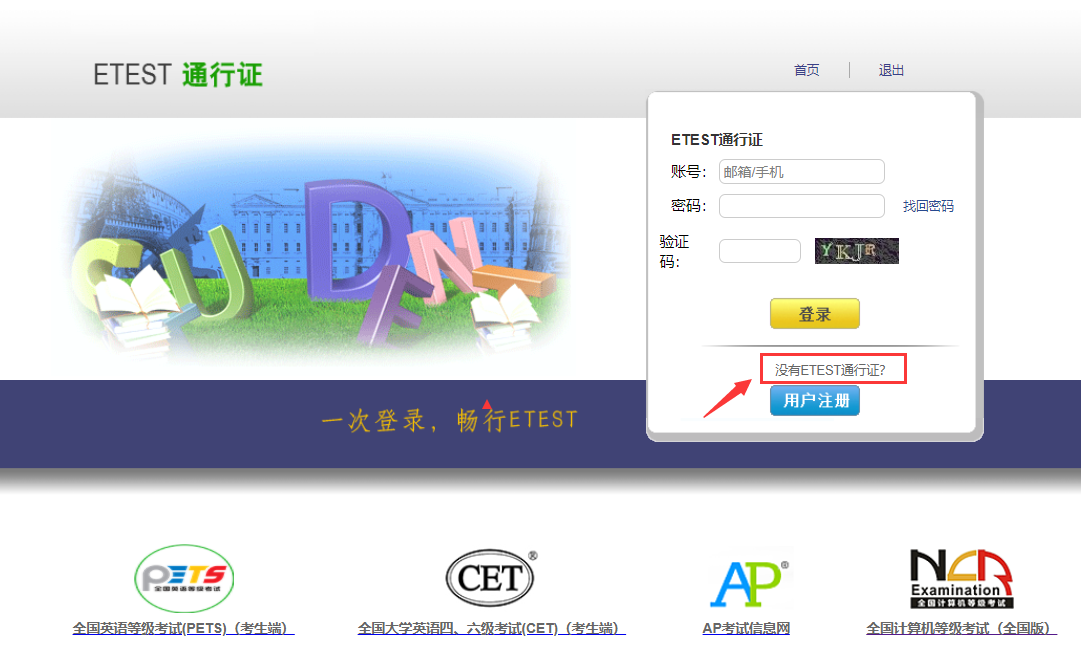 使用系统网上报名需要ETEST通行证账号。已有通行证账号(英语四六级考试、PETS考试、AP考试已注册通行证账号)的考生可直接登录报名网站报名;无通行证账号的考生登录通行证管理网站注册,之后再登录报名网站报名。