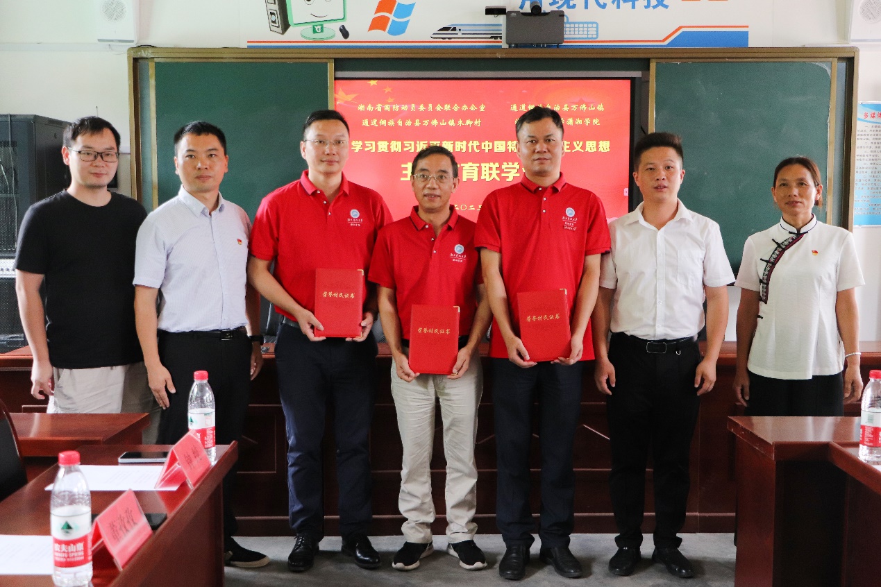 为大力弘扬爱国精神,增强全民国防意识,牢固树立为国防奋斗献身的责任感和使命感,7月8日上午,永利官网联合湖南省国防动员办公室、万佛山镇党委、木脚村总支在木脚完全小学多媒体会议室开展学习贯彻习近平新时代中国特色社会主义思想主题教育联学活动。永利官网党委书记廖双红、正处级干部周光明、党委副书记叶军、学工办主任董孜孜及省国动办驻木脚村第一书记王成、万佛山镇党委副书记向军军、党委委员杨波、木脚村党总支书记吴菊凤等莅临会场,永利官网“青年红色筑梦之旅”实践团师生成员参会学习。本次会议由向军军主持。