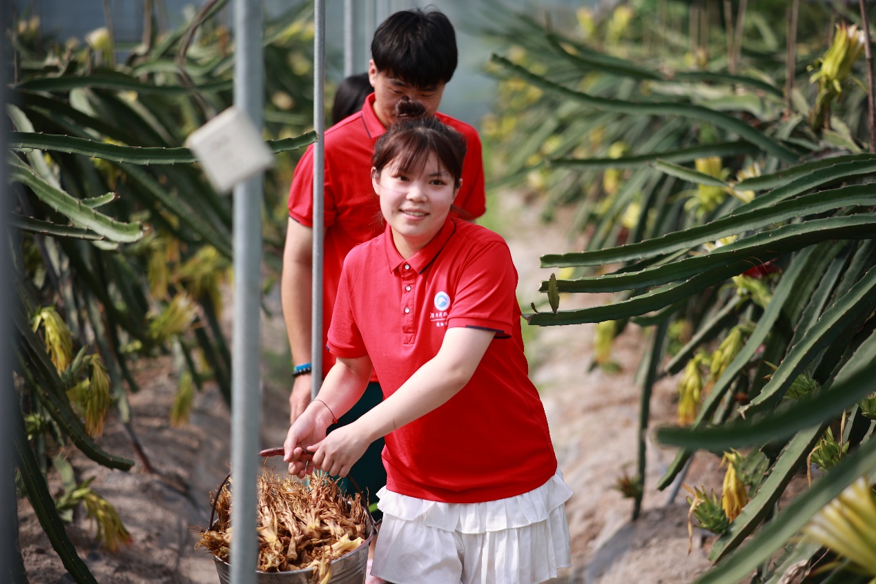 火龙果种植业作为木脚村特色农业发展的重点备受外界关注,为保植株健康生长,促进其高产高质开花结果,实践团成员晨曦乍现时便一同行至木脚村火龙果种植基地,在果农指导下身体力行,协助梳理未成熟火龙果枯萎残花。他们保持轻柔操作,在把受损枯败的残花妥善剪除,对长势较差、有病虫害的枝条也进行了适量修剪后又收集整理好剪下的残花和枝条,以防止其堆积在地面或盆土中而引发病虫害。烈日高照,面对铁桶里已装得满满当当的残花败絮,实践团成员身汗涔涔但笑连连,剪枝采花工作就此圆满完成。他们回程时把歌欢唱,期许当地火龙果地喜迎丰收,果子畅销无阻。