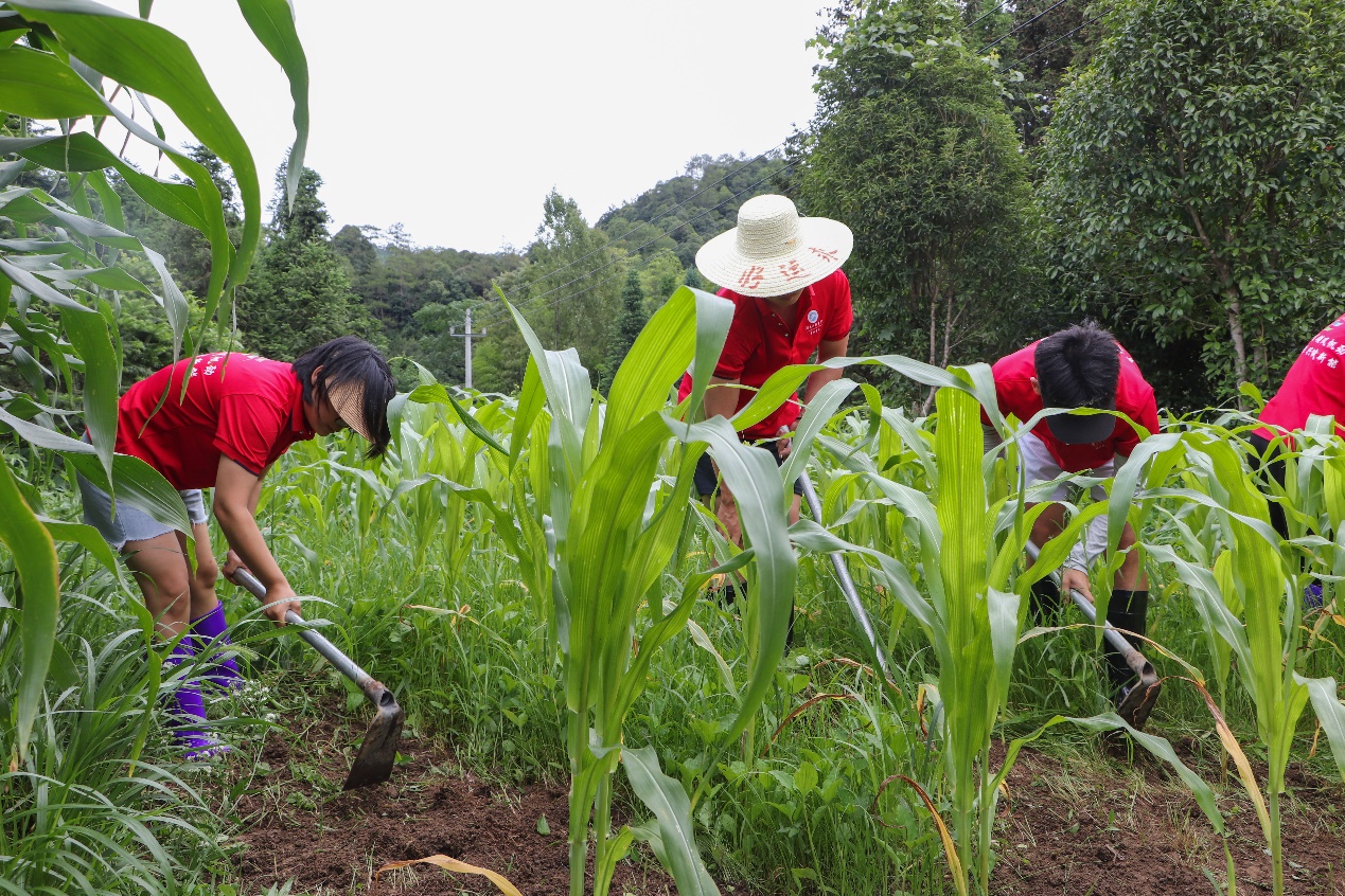 夏风吹过,潇湘青年学子头顶烈阳、手持锄头,在木脚完全小学周边的学生劳动教育基地务实为民、辛勤耕耘,尚未成长为高秆玉米的田地内肆意丛生的杂草被实践团成员一遍遍的挥舞而铲叶刨根,越堆越高。随后,师生跟随有丰富经验的当地阿姨将铲除的杂草和碎土一起堆肥于苗秆下,以减少水分蒸发、营养物质流失。一上午的努力,实践团成员终于将田地的杂草清理干净,抛下汗水的土地孕育金黄的硕果,这是实践团成员和在校孩子们辛勤种植的成果。稚嫩的玉米苗就此更加地茁壮成长,实践团成员也由此戮力奋进,获得成长。