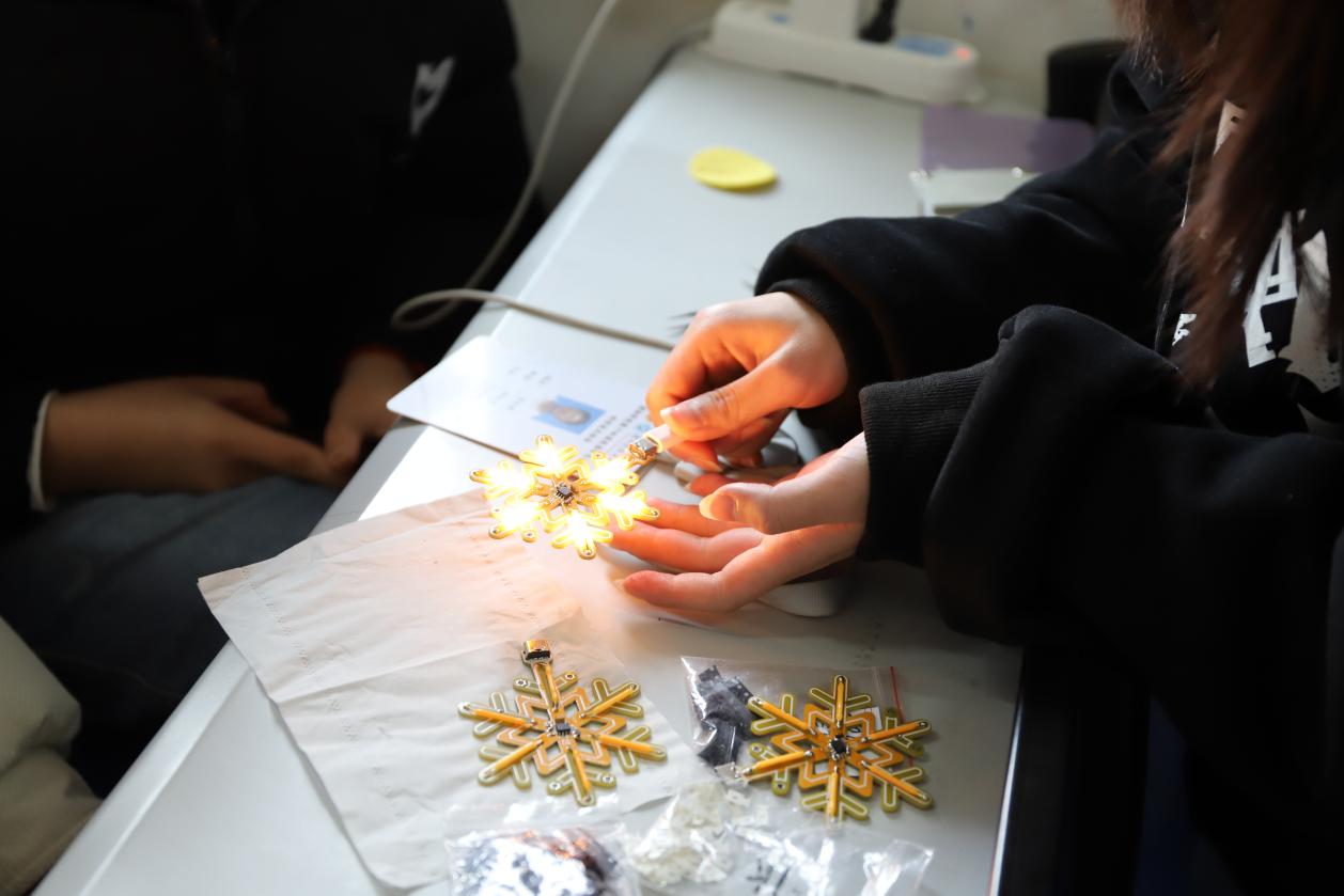 经过不断的摸索与实践,同学们完成了各自的焊接制作,雪花灯通过电流开始闪烁发光。在看到自己的创作成果后,22级文学三班的李雄自豪地说道:“这次活动实现了自己想要完成一个雪花灯制作的愿望,提升了自己的动手能力、沟通能力,拉进了与大家的距离,虽然活动时间不长,但对我的影响十分深刻。”